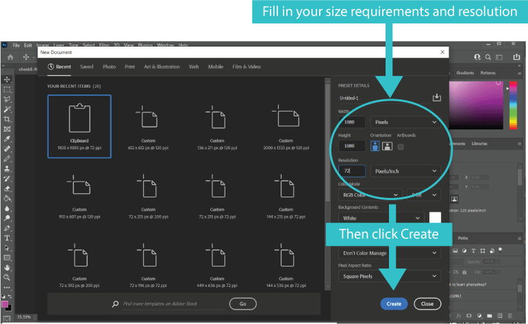 2. Enter the image size Height and Width, select portrait or landscape and then select the resolution (recommended will be 72pixels/inch) > Create